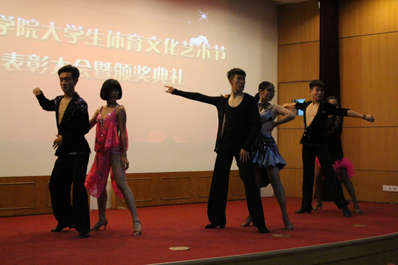 一段拉丁舞表演和简短的活动精彩视频回放拉开了此次大会的序幕。表演和展映结束后院党委常务副书记、副院长汤岩、副院长史国生、院纪委书记李江、学生工作部部长、学生工作处处长陆玉林和教务处处长严海平上台为本次体育文化艺术节作总结表彰。
