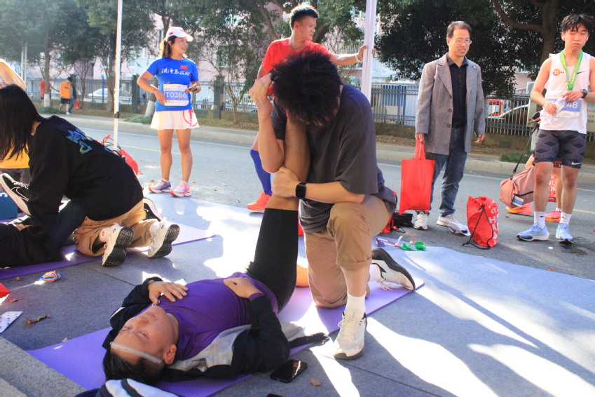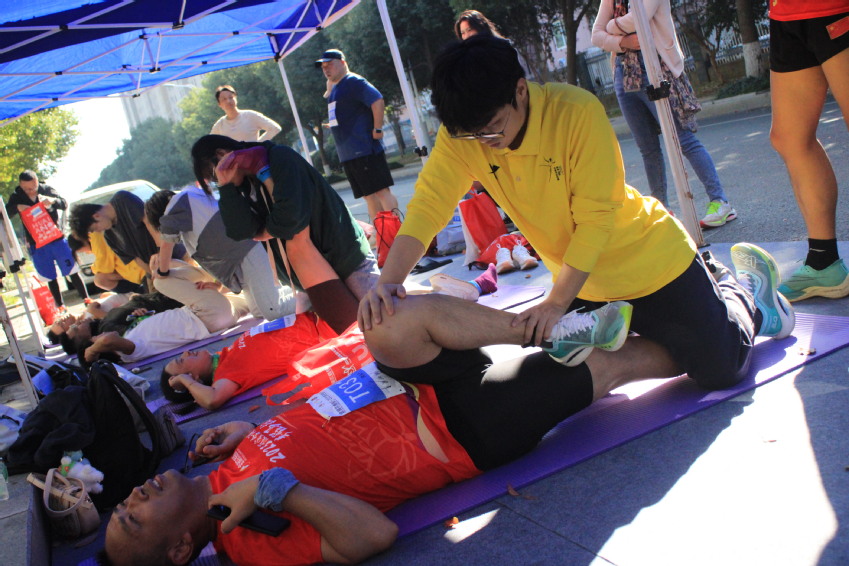 运动健康学院赛后恢复志愿者团队成立于2015年,开创了国内马拉松赛后恢复的新模式。在本次赛事中,学院选拔了具有赛后恢复服务经验的学生组成专业的拉伸志愿服务团队。为确保志愿工作顺利进行,运动健康学院带队老师付乐提前对学生进行了赛事知识和志愿服务技能培训,力求让更多参赛者享受到专业的赛后拉伸放松体验。