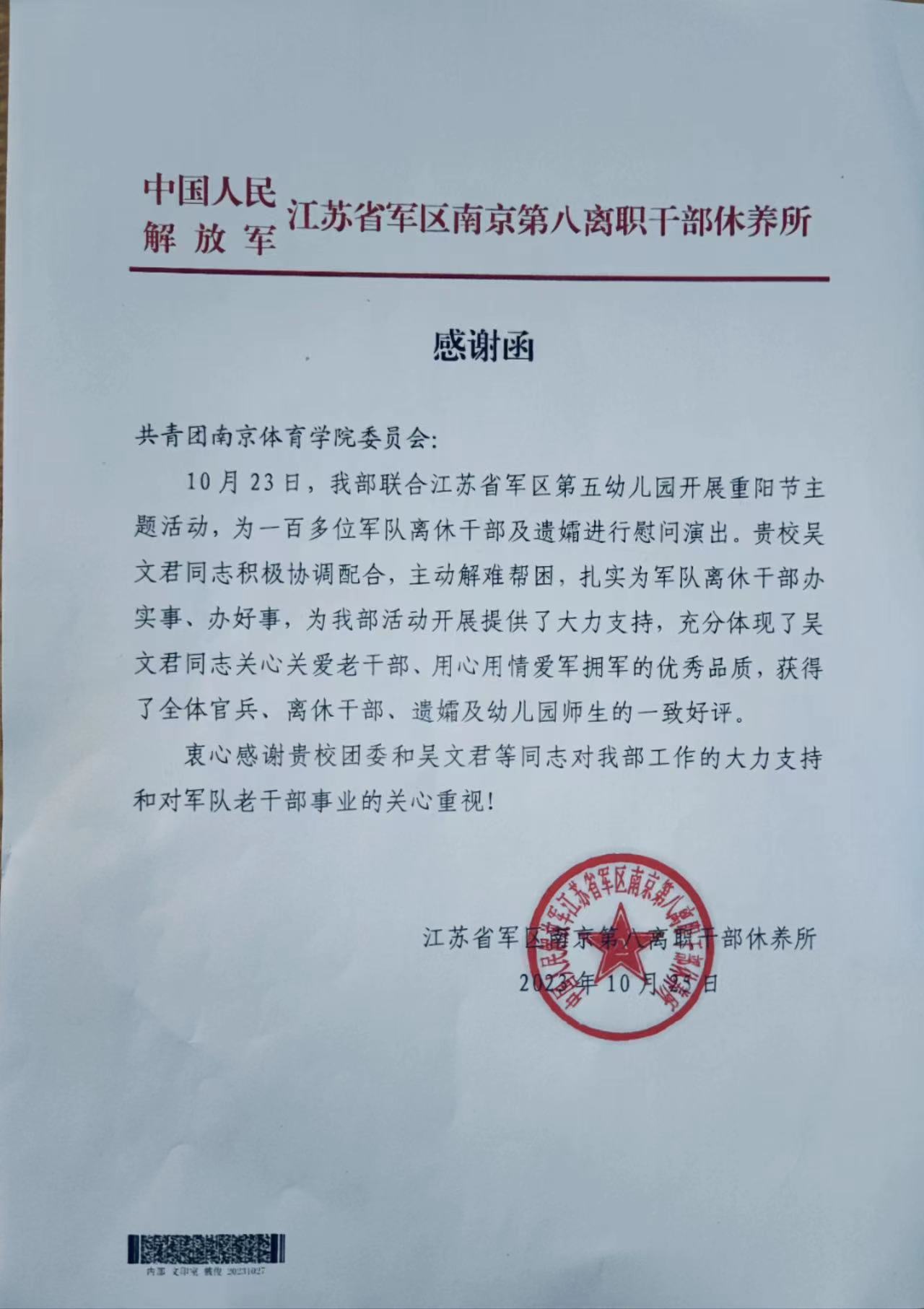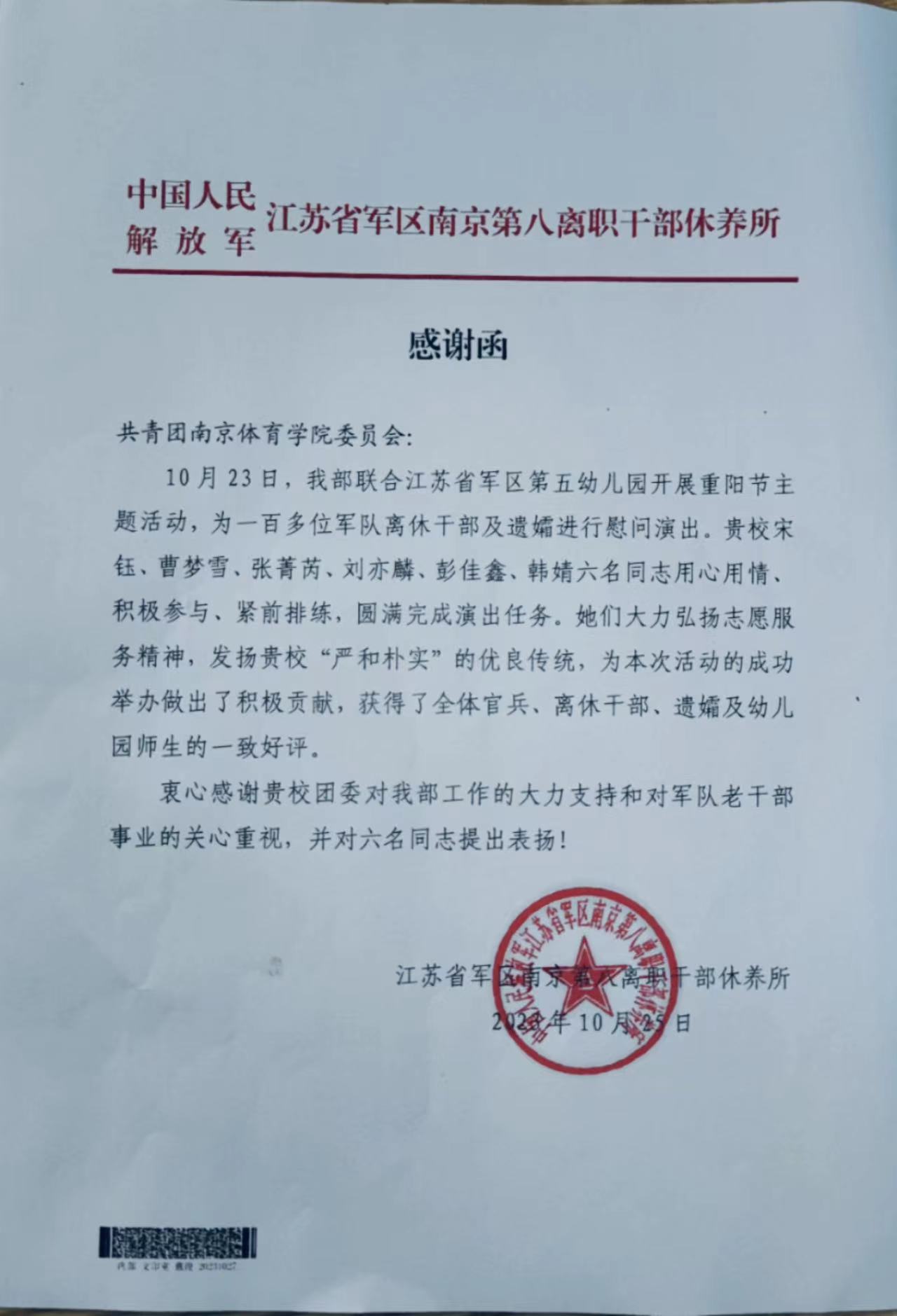 精心演出,用情拥军。同学们的表现得到了江苏省军区第八干休所的充分肯定,为此,江苏省军区南京第八干休所特向36365送来写有“鱼水情深,爱军拥军”的锦旗和感谢函。