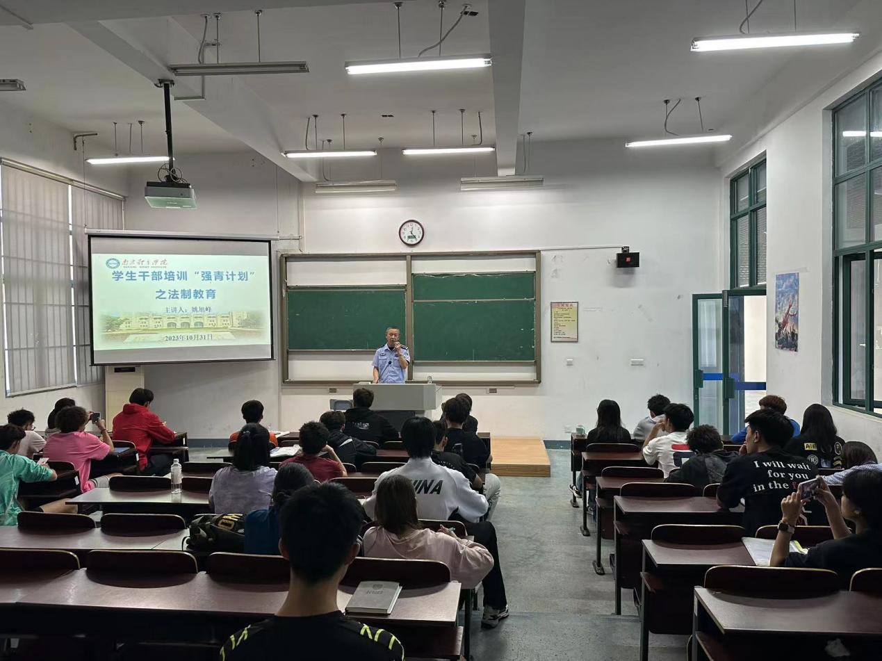 为了进一步加强校园安全稳定和思想道德建设,增强大学生学法、懂法、守法的意识,传播法律知识,提高法治意识和法律素养。10月31日中午,运动训练学院学生干部培训“强青计划”开展了法制教育专题讲座。本次讲座特邀南京市公安局栖霞分局姚旭峰警官主讲。