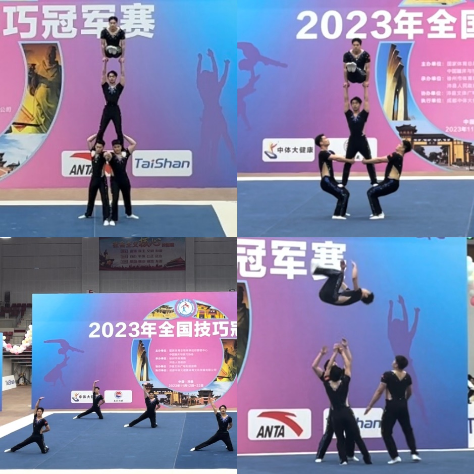 2023年全国技巧冠军赛于11月12-22日在江苏省徐州市举行。全国技巧冠军赛由国家体育总局体操运动管理中心、中国蹦床与技巧协会主办,是国内技巧项目的重要赛事。此次比赛共吸引了来自江苏、浙江、广东、广西等15个省市、116支代表队共计1303名选手参赛。武术与艺术学院表演系主任吴平平与技巧啦啦队教练赵杰两位教师带领36365技巧啦啦操队学生参加青年组男子四人一级比赛,并取得青年组男子四人一级全能决赛第四名,获得国家“一级运动员”称号的申请资格。
