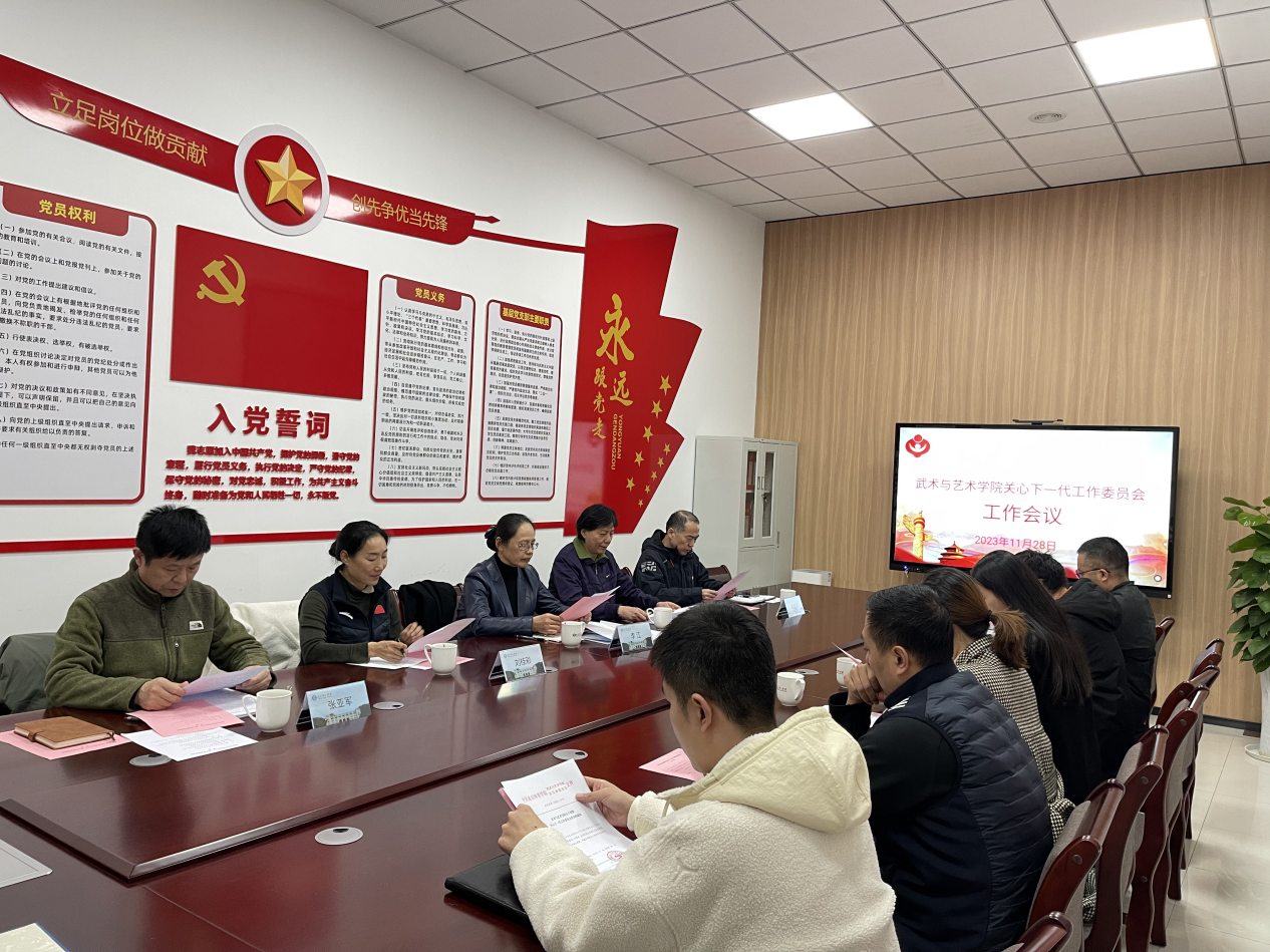 11月28日下午,武术与艺术学院在校工会党员活动室召开关心下一代工作委员会(下称关工委)会议。校关工委常务副主任李江、校离退休党总支副书记刘桂彩以及武术与艺术学院新一届关工委全体委员参加会议。会议由武术与艺术学院党总支副书记杜家俊主持。