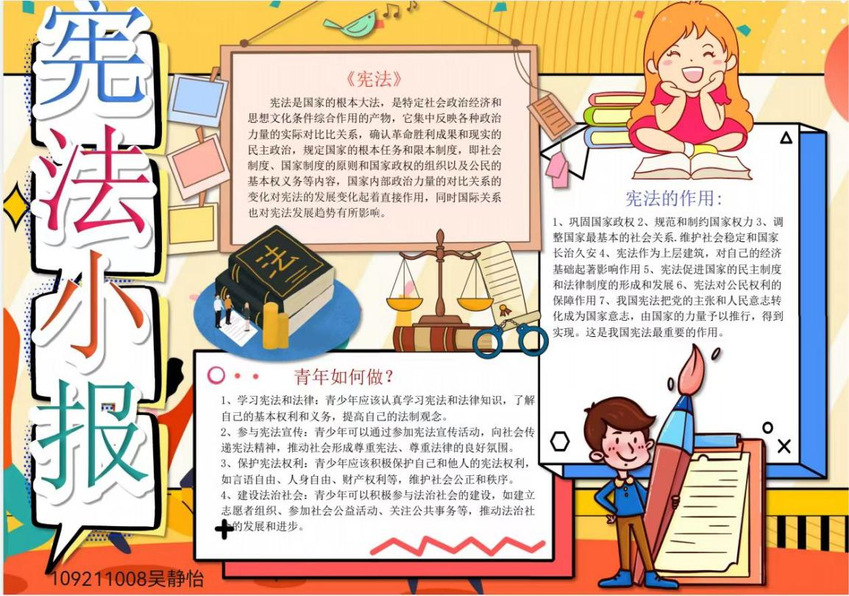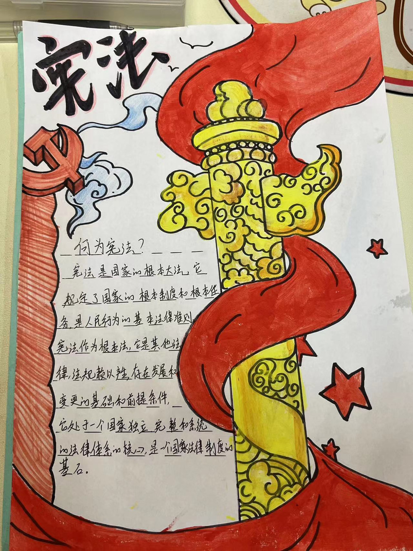 征集宪法主题艺术创作,营造法治校园文化氛围,同学们紧扣主题,设计了手抄报,展示出自己对宪法学习一丝不苟的态度,激发了同学们学习宪法和法律的热情,推动了校园法治文化建设。