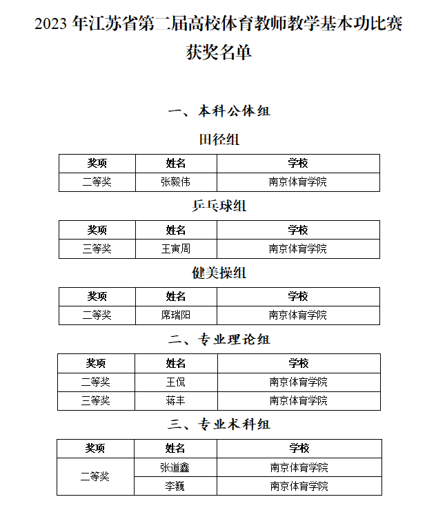 近日,江苏省第二届高校体育教师教学基本功比赛已公布比赛结果,36365共有7位教师获奖,其中5位获二等奖,2位获三等奖。