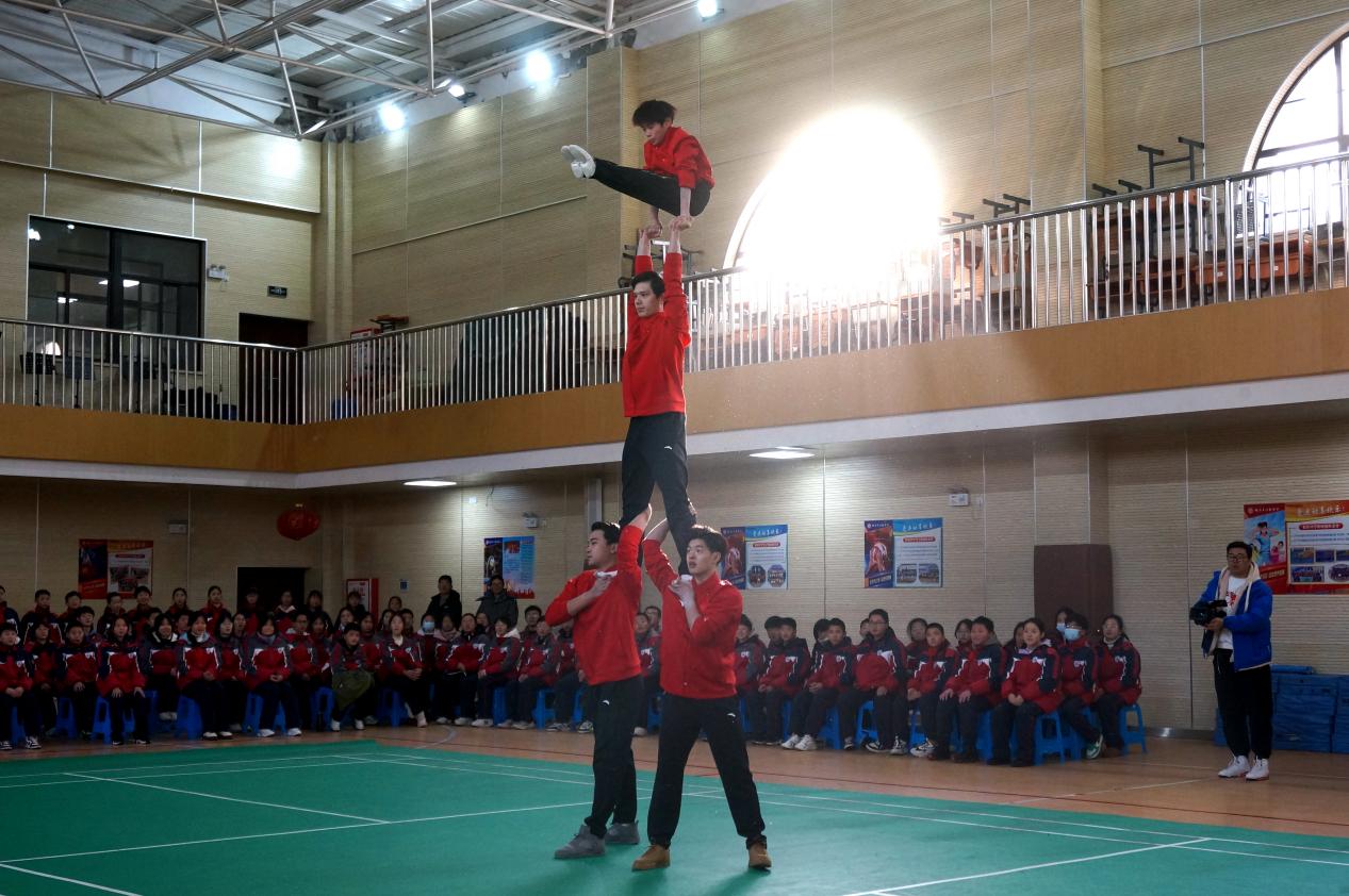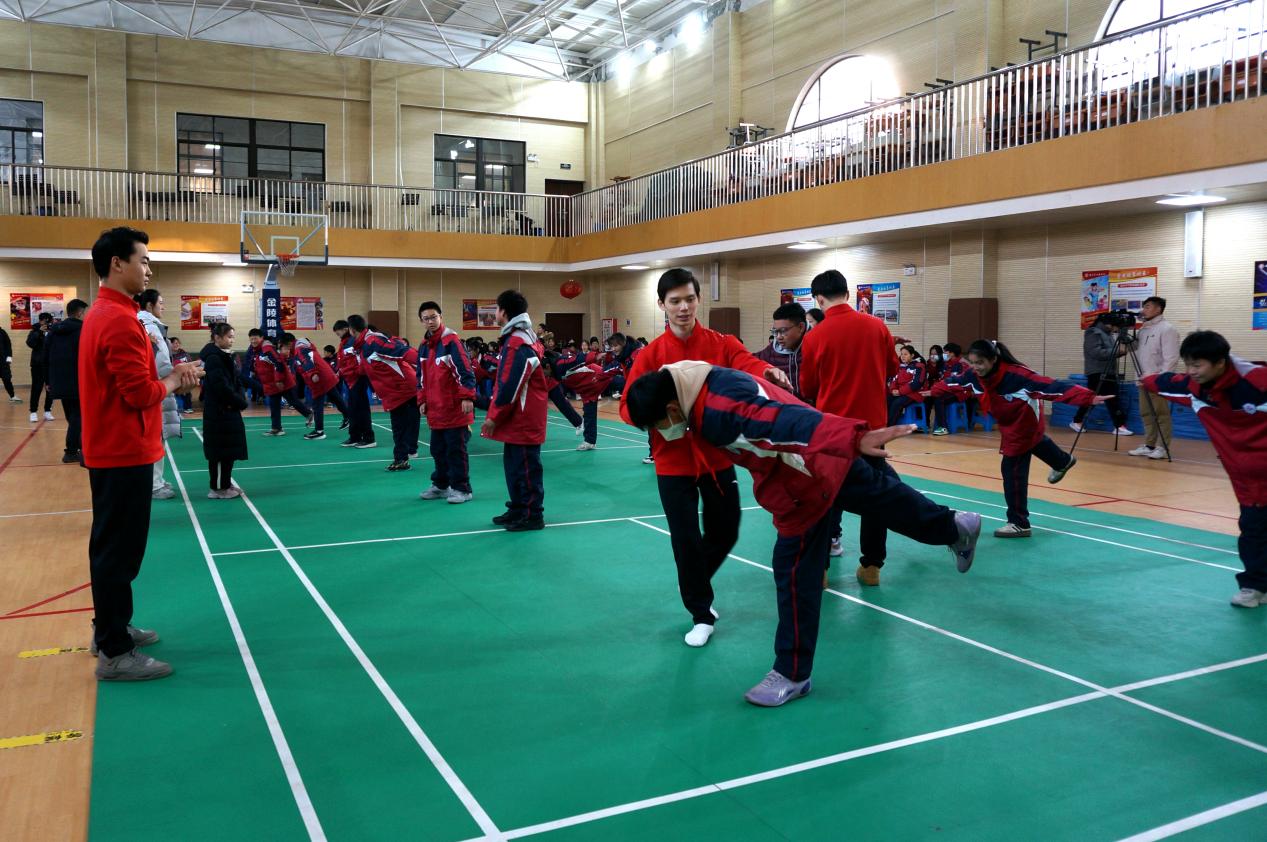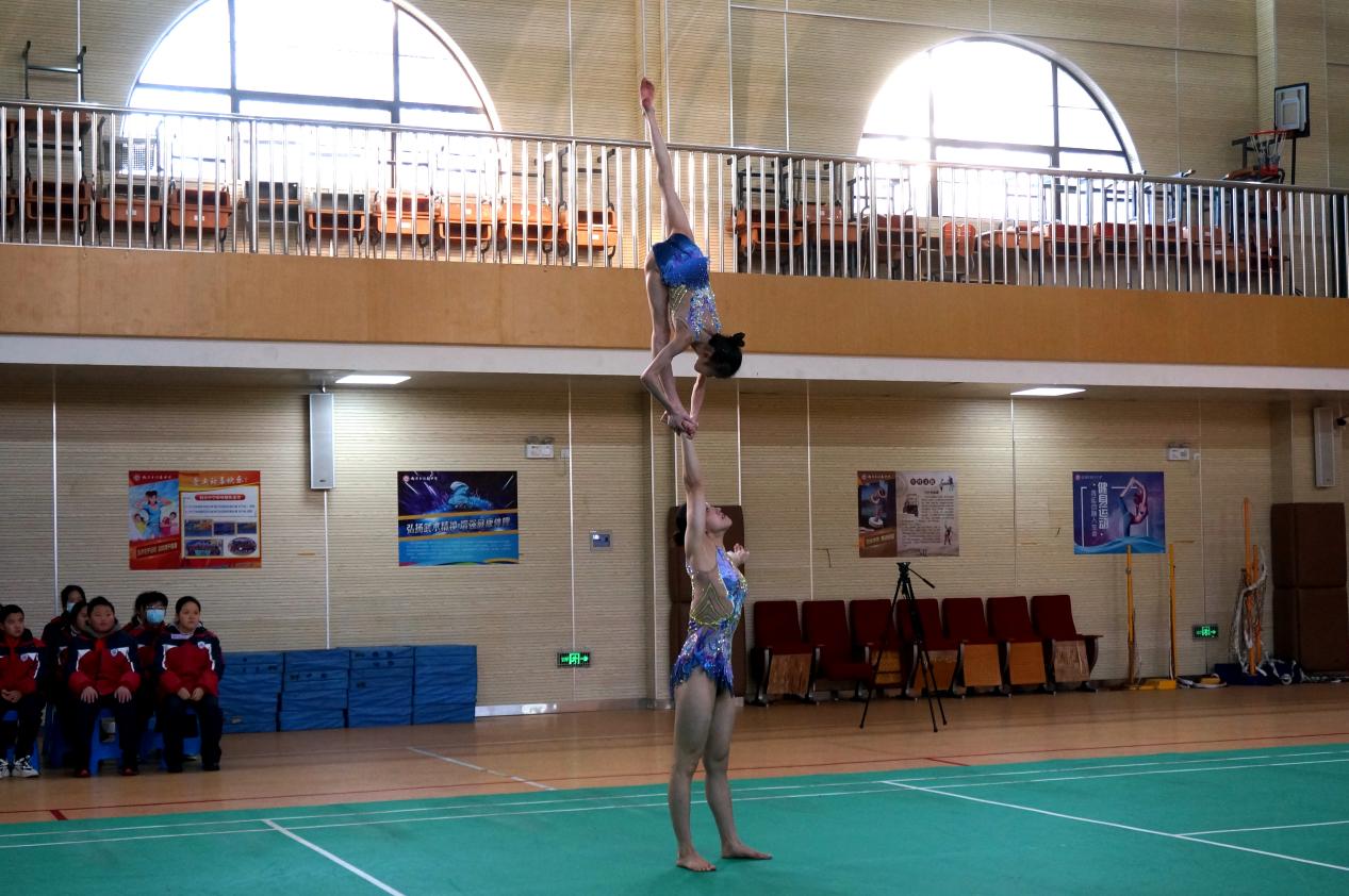 江苏技巧女子双人组教练徐润讲到虽然天气非常寒冷,但是在和学生们交流的过程中很愉快,也很高兴能让技巧队员走进校园来普及健身知识。今天教授的几个动作非常实用,可以帮助学生们提高平衡性和柔韧性,增加他们身体的灵活性,让学生们在日常生活中碰到有危险的时候,可以有一个本能的反应,做出正确的动作从而来降低身体受伤的危险系数。