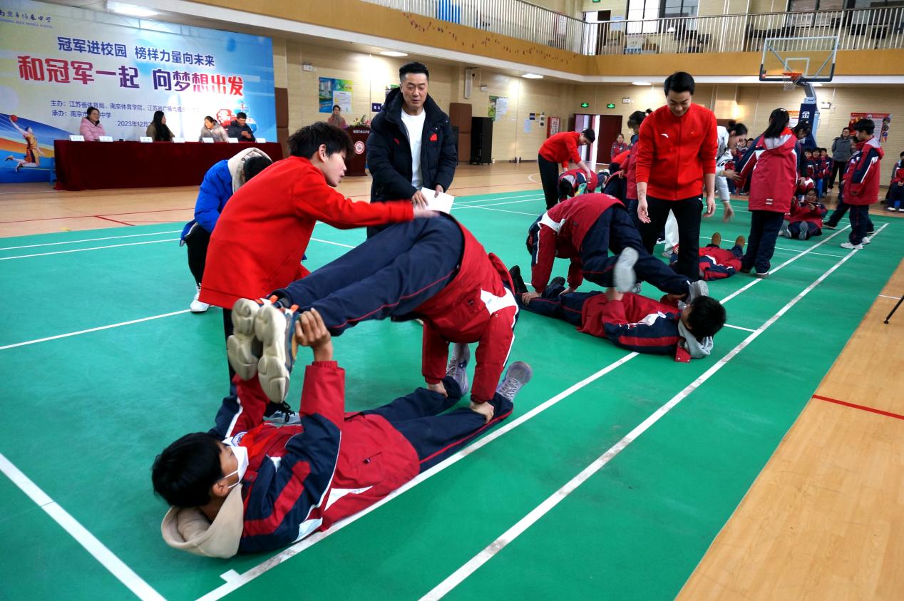 江苏技巧队男子四人组教练周桐表示,很高兴和伯乐中学的同学们一起参加这样的活动。技巧类运动项目要人与人之间默契配合,练习技巧的道路上遇到了各种各样的困难,要直面失败、战胜失败,一步步地坚定向前,才能最终收获冠军,希望同学们在学习生活中也有这种不畏艰难险阻,勇攀自我高峰的精神。