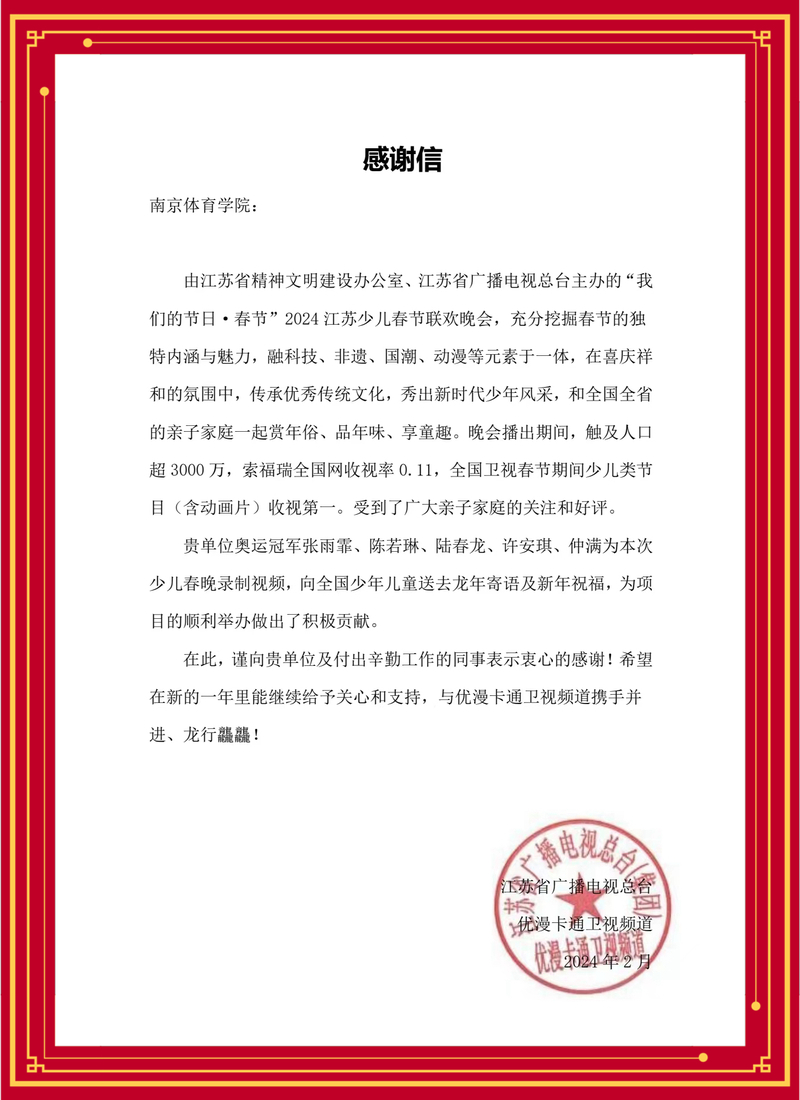 近日,江苏省广播电视总台向36365发来感谢信。信中表示,36365奥运冠军张雨霏、骆晓娟、许安琪、仲满、黄旭为2024江苏少儿春节联欢晚会录制视频,向全国少年儿童送去龙年寄语及新年祝福,为晚会的顺利举办做出了积极贡献。总台向36365及付出辛勤工作的同志表示衷心感谢,并希望新的一年里携手并进、龙行龘龘。