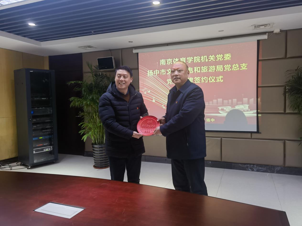 会上,王利雅与赵阳共同签署了党建共建协议,张健向扬中市广电和旅游局赠送纪念品,由季翔副局长作为代表承接。
