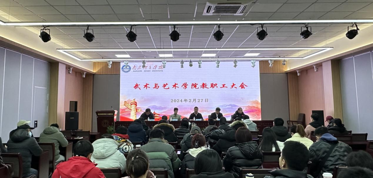 2月27日下午,武术与艺术学院在工会多功能厅召开全院教职工大会。校党委常委、纪委书记、派驻监察专员周和林,校党委常委、组织部部长殷怀刚出席会议,学院全体教职工参加。党总支副书记杜家俊主持会议,会议共分为两个阶段。