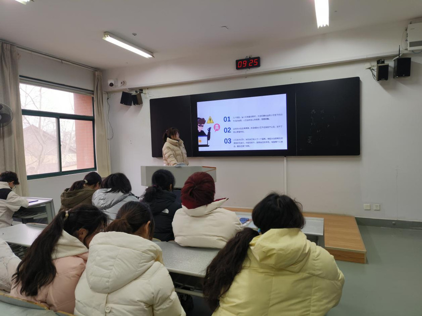 随后学院团委副书记、辅导员魏晓民老师讲解了春季校园传染病防治相关知识,建议大家饮食健康,保证体育锻炼,掌握一项运动技能,宿舍和教室定期开窗通风,重视预防工作,落实预防工作,有效预防传染病的传播。同时就校园安全、宿舍用电问题,诈骗问题,交通问题等方面进行了说明和建议。她倡导同学们要加强反诈意识,擦亮眼睛,要为家人负责,为生命负责,为社会负责,保护好自己的生命和财产安全。