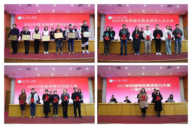 党委副书记兰亚明宣读了2023年度本科教学突出贡献人物、2023年度校最佳教案获奖人员、2023年校教师教学创新大赛获奖人员、2023年校辅导员素质能力大赛一等奖获奖人员名单,对2023年度在36365本科教学领域获奖的教职工进行了表彰,校领导分别为获奖人员颁发证书。