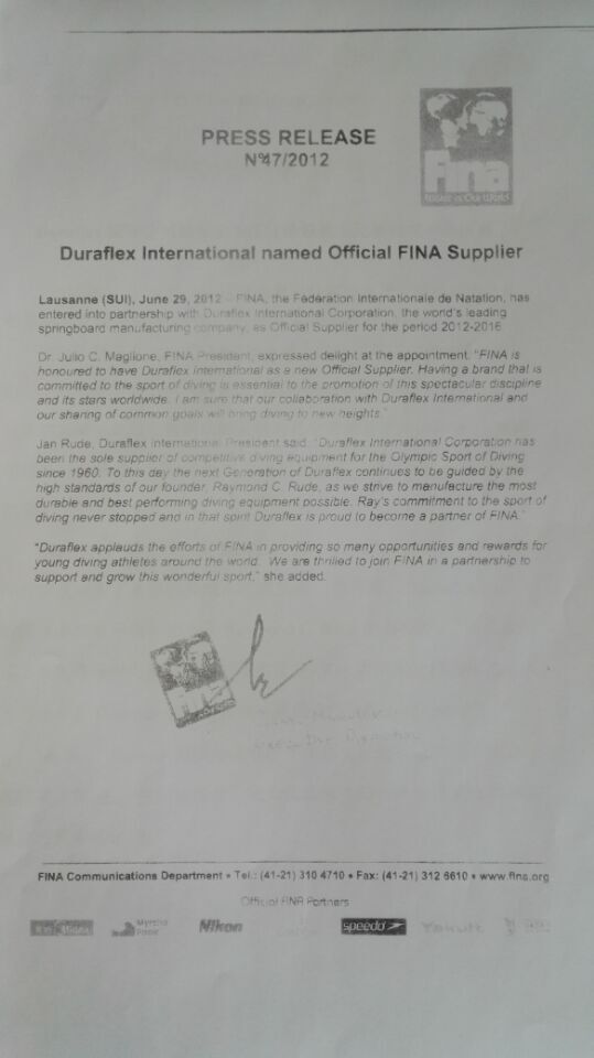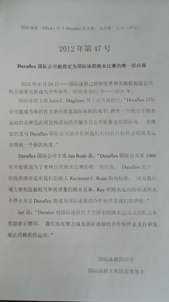 国际泳联指定美国Duraflex公司的跳水板作为国际跳水比赛唯一供应商(附证书和翻译件)。肇庆市福临贸易有限公司系美国Duraflex公司在国内唯一代理商。因此,我院决定采取单一来源谈判的方式进行购置。