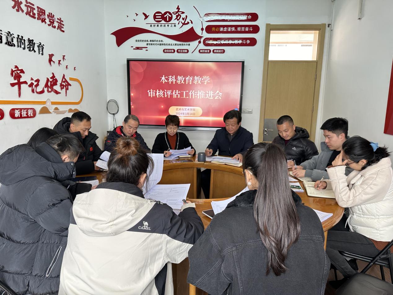 3月14日下午,武术与艺术学院召开本科教育教学审核评估工作推进会。党总支书记叶瑛、党总支副书记杜家俊、副院长唐芒果出席会议,会议由唐芒果主持,各系正副主任、教学秘书、辅导员参加会议。
