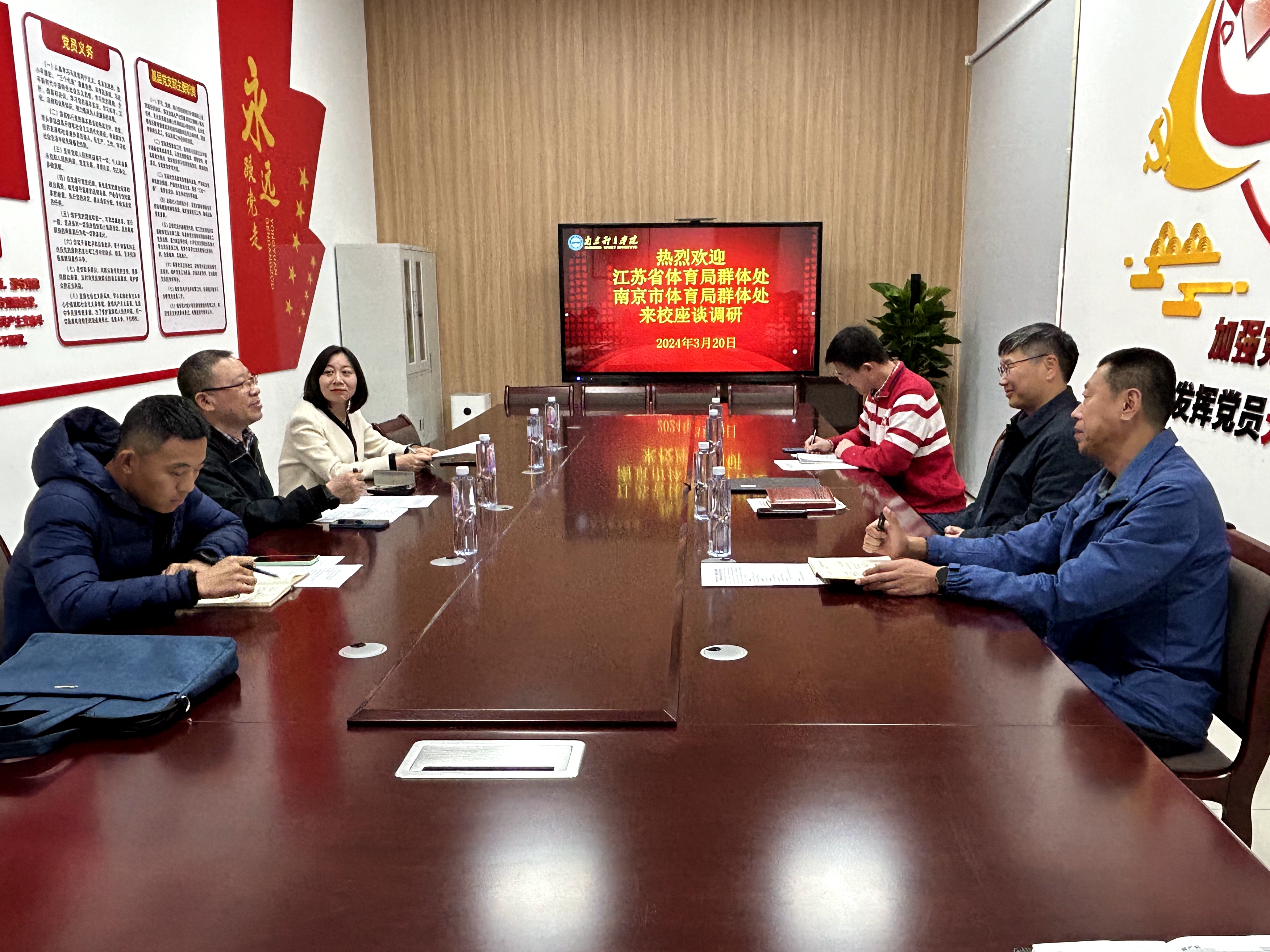 3月20日下午,江苏省体育局群体处副处长张建槽、南京市体育局群体处处长姚安等一行来校座谈交流。党委常委、副校长陈爱国出席座谈会。继续教育学院副院长朱海峰主持会议,学院相关人员参加了座谈会。
