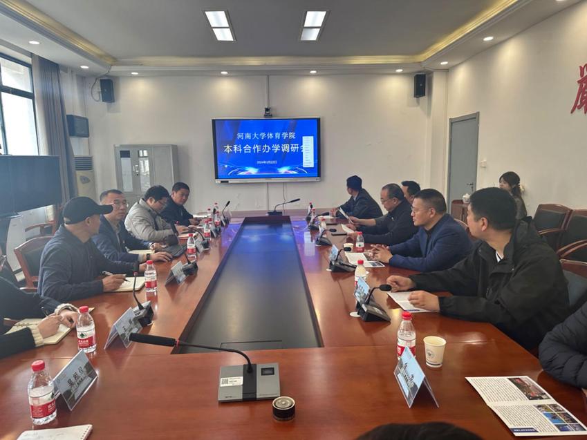 3月22日下午,河南大学体育学院党委书记段廷良、河南大学体育学院院长周珂、河南大学体育学院党委办公室主任周屹嵩、研究生与科研办公室主任时震宇、继续教育办公室主任司磊、副教授金龙一行来体育产业与休闲学院,就本科中外合作办学进行调研。体育产业与休闲学院院长王龙飞、体育产业与休闲学院党总支副书记陈志、体育经济与管理系主任张建明、体育经济与管理系副主任孙绪芹及中外合作办学相关教师出席会议。会议由院长王龙飞主持。
