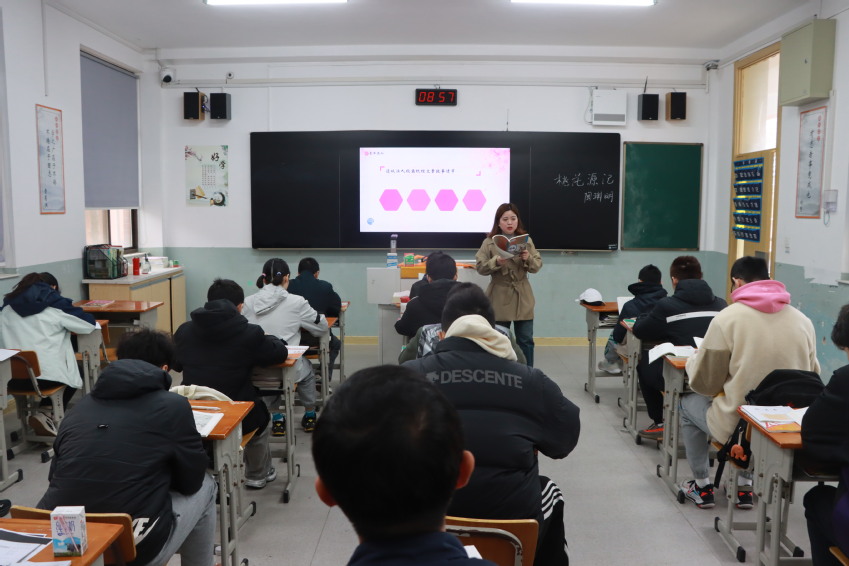 第二节课,由杨丽霞老师执教《桃花源记》的第二课时。杨老师利用多样化的教学手段,调动学生的积极性。她围绕桃花源的“美”、“乐”与“奇”三个模块,巧妙地创设了教学情境,引导学生结合自己的生活经验,批文入境,展开合理的联想与想象,以此达到教学目标,攻克重难点。同时,她注重鼓励学生发言,在师生对话中促进学生对问题的深度分析,也让学生更好地走入情境、感同身受,从而课堂收放自如。