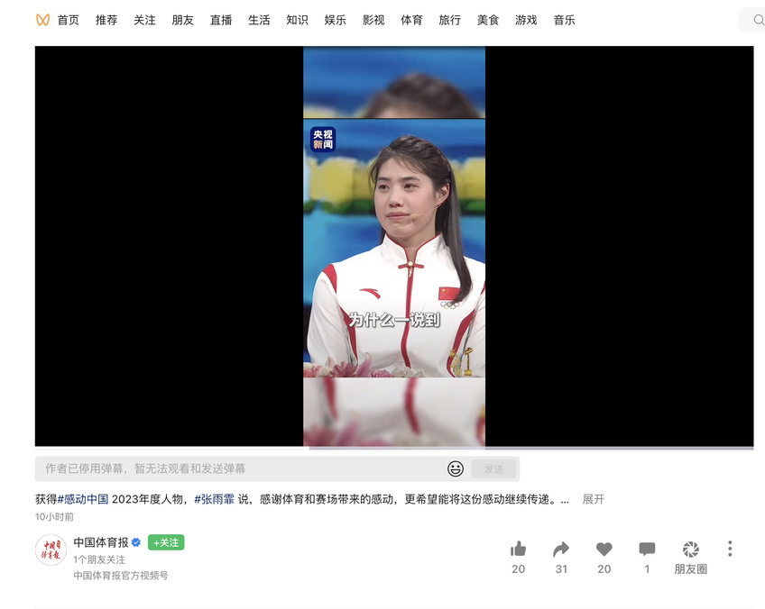 【中国体育报】张雨霏获评感动中国2023年度人物