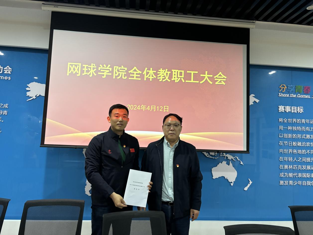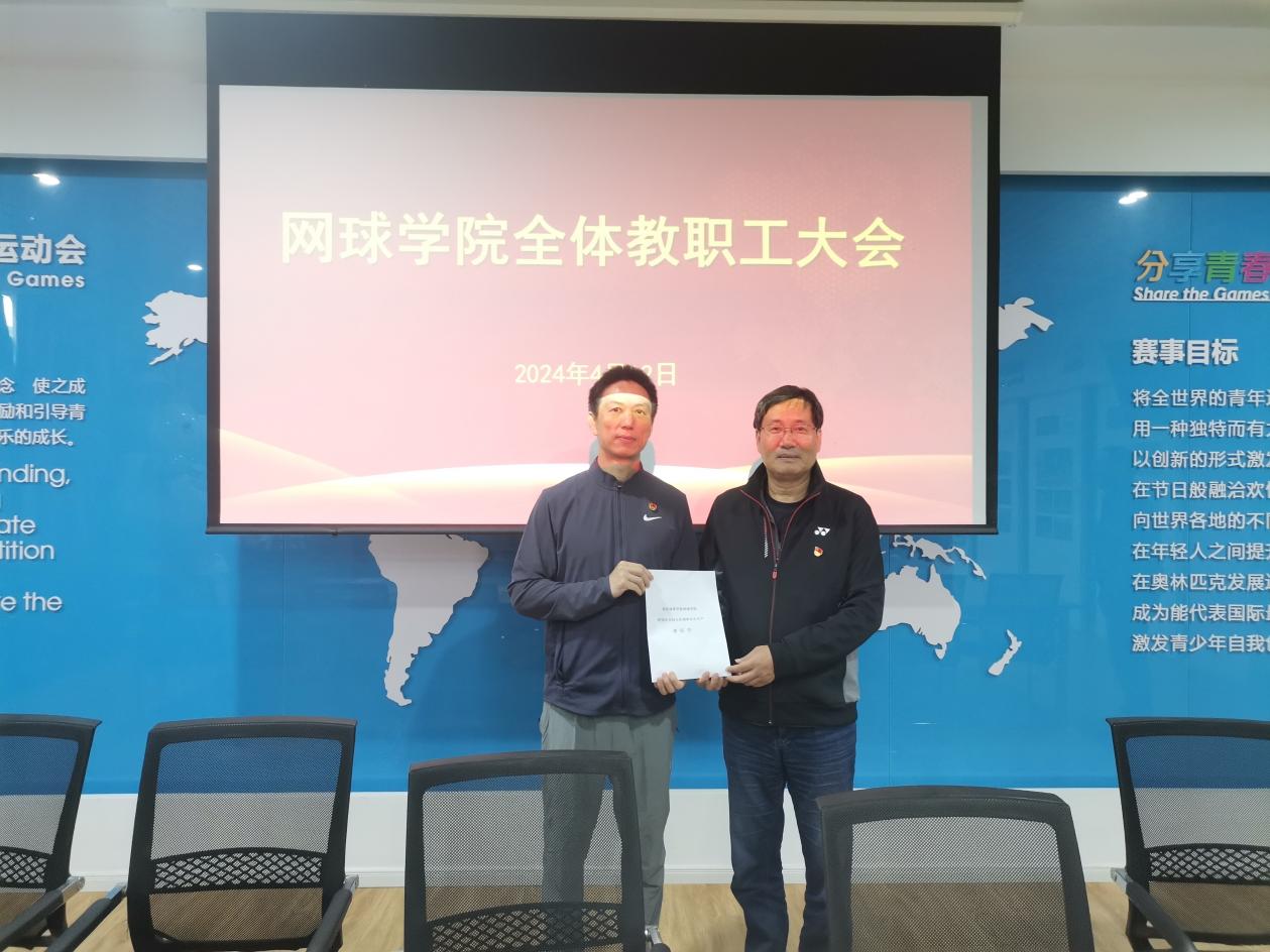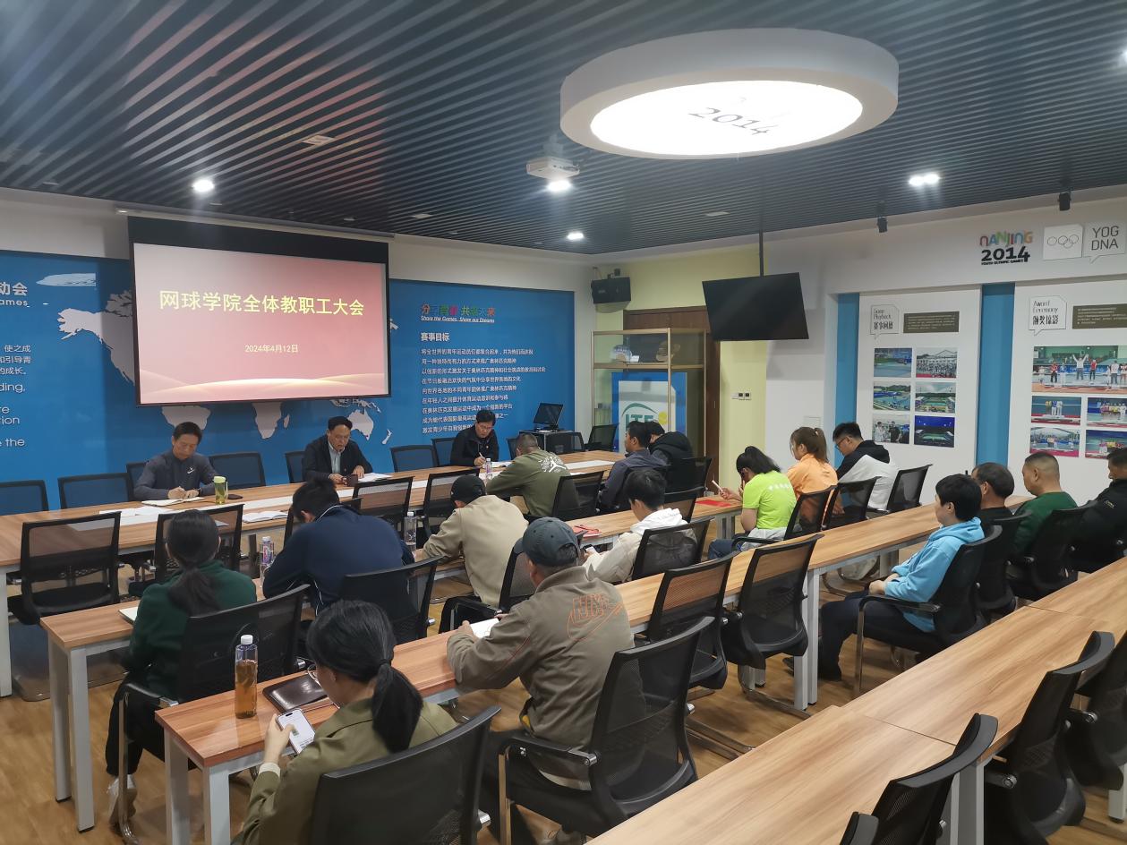 2024年4月12日上午,网球学院在青奥厅召开全体教职工大会。会议分两个阶段进行,网球学院全体教职工、外聘教练员、队医、南京钟山网球发展有限公司全体员工参加会议。