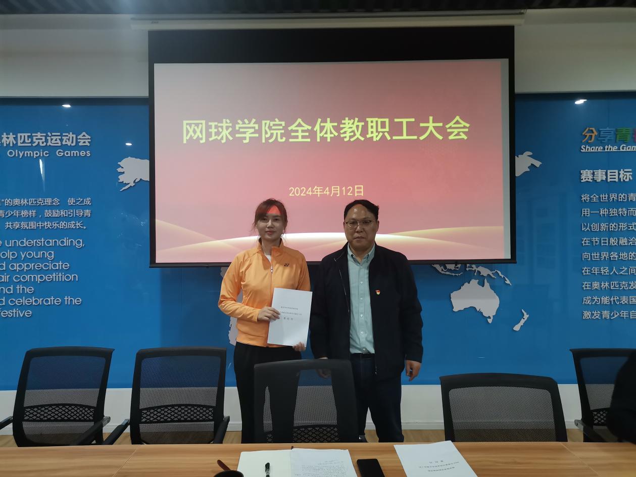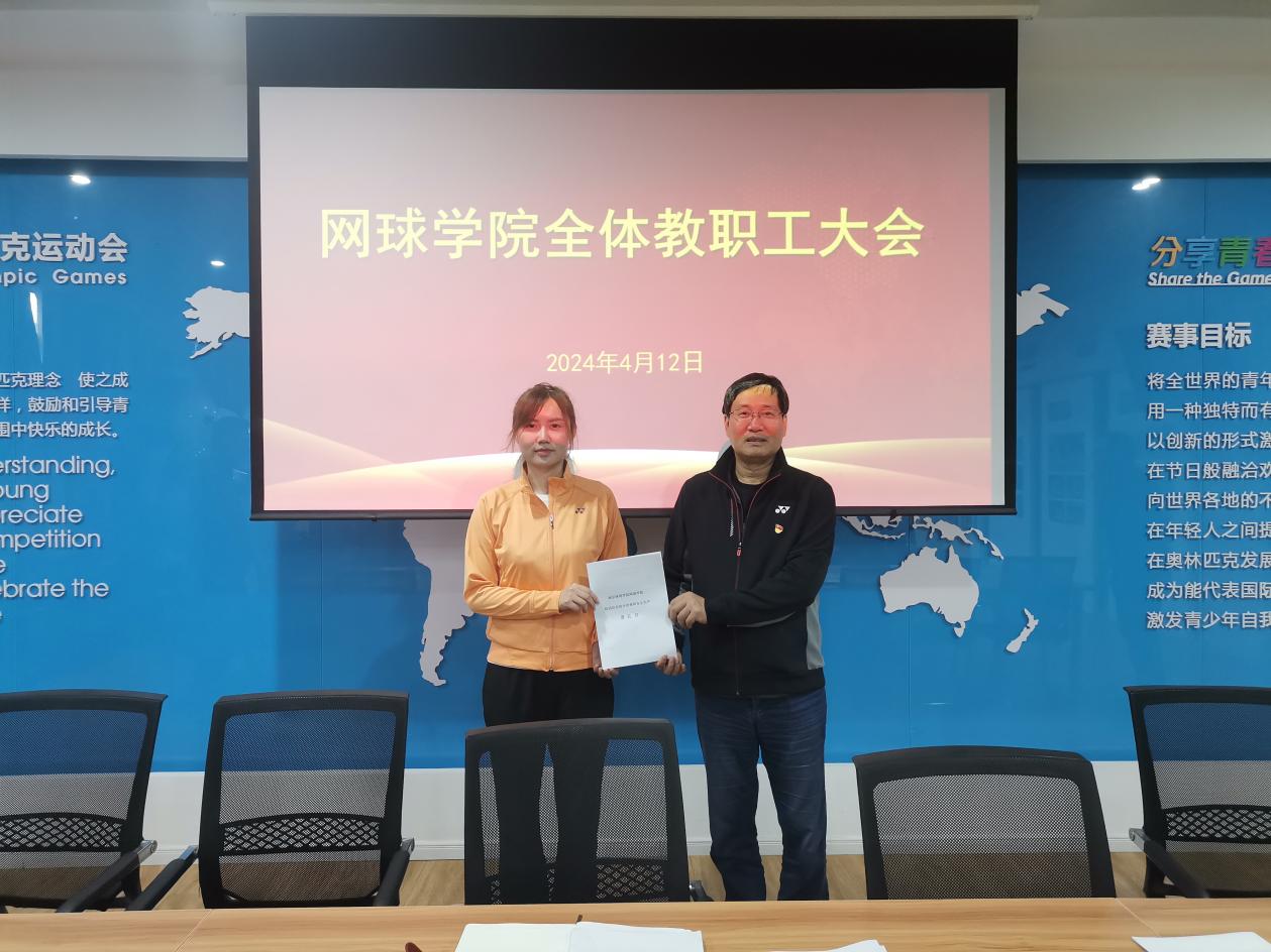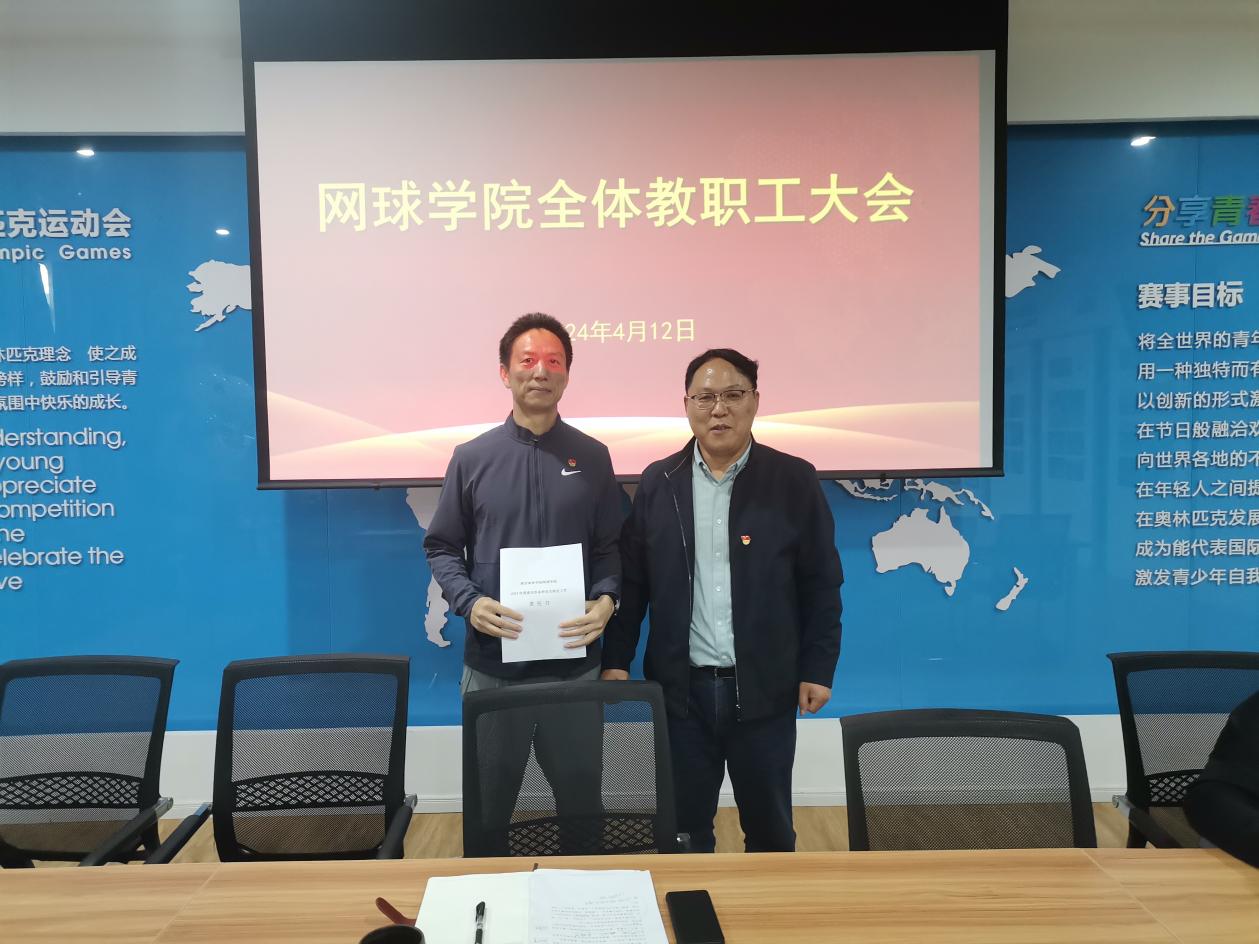2024年4月12日上午,网球学院在青奥厅召开全体教职工大会。会议分两个阶段进行,网球学院全体教职工、外聘教练员、队医、南京钟山网球发展有限公司全体员工参加会议。