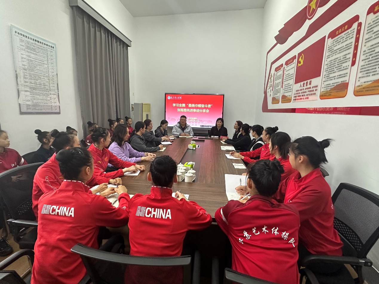 2024年4月15日下午,艺术体操队召开学习全国“最美巾帼奋斗者”张雨霏先进事迹座谈会,艺术体操队全体管理干部、教练员、一、二、三线运动员参加会议。会议由领队杨干主持。