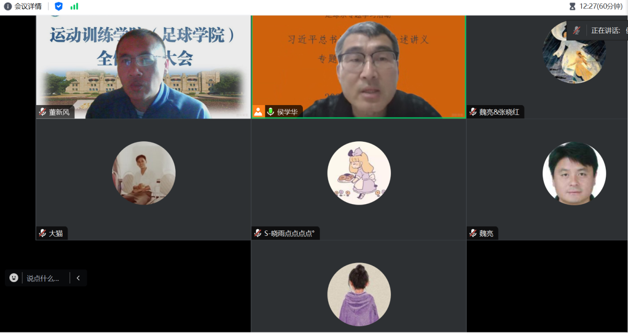 根据教务处统一要求和运动训练学院统一安排,结合足球系教师实际情况,4月17日中午,足球系利用网络会议室,开展了基层教学组织业务集中学习活动。