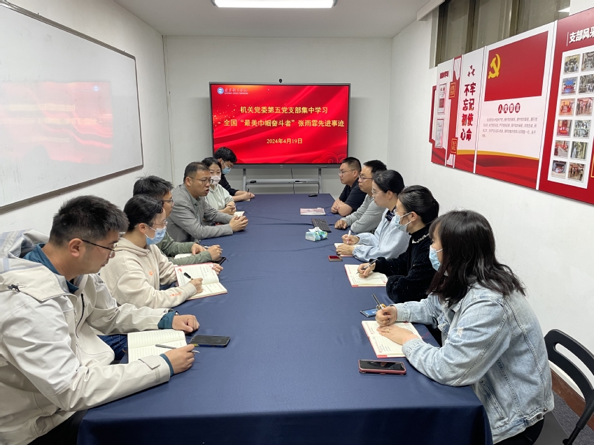 4月19日上午,机关党委第五党支部在图书馆117室组织学习全国“最美巾帼奋斗者”张雨霏先进事迹。会议由支部书记叶强主持,支部党员参加会议。