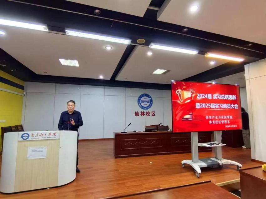 4月26日下午,体育经济与管理系在仙林大学生活动中心召开2024届毕业实习总结表彰暨2025届实习动员大会。体育产业与休闲学院党总支书记王进,体育经济与管理系系主任张建明,副主任孙绪芹、王杉及全体教师出席表彰大会,会议由系副主任王杉主持。