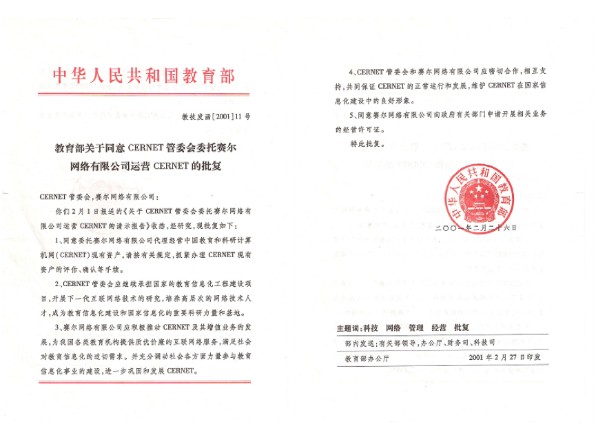 根据《教育部关于同意CERNET管委会委托赛尔网络有限公司运营CERNET的批复》(教技发函[2001]11号),CERNET管委会已委托赛尔网络有限公司代理经营中国教育和科研计算机网(CERNET),开展相关业务。鉴于合作单位的唯一性,我院将就申请教育网域名及接入教育网项目进行单一来源采购谈判。