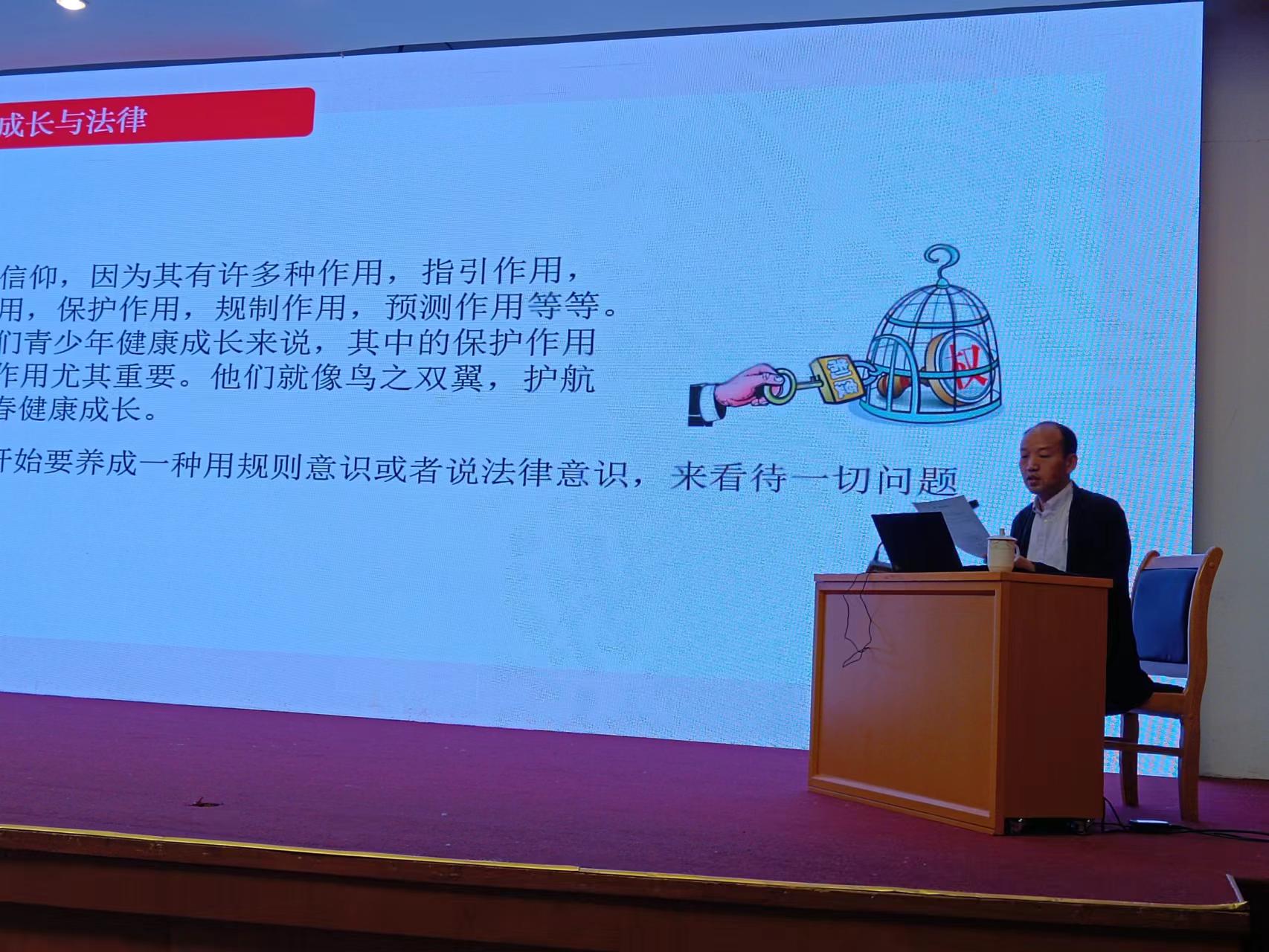 杨向涛法官分别从人的成长与法律“人性之辩,法律历史,法律意识”、实践中的青少年法律制度“法律体系简介、司法体系简介、青少年保护法律制度”、保护青春的法之一翼——保护“权利确认体系、人身安全保护、财产权益保护、精神权益保护、法律实践保护”、保护青春的法之二翼——规制“义务规则体系、行为边界意识、平等权利意识、法律的惩罚与矫治”四个方面进行了精彩的讲解。