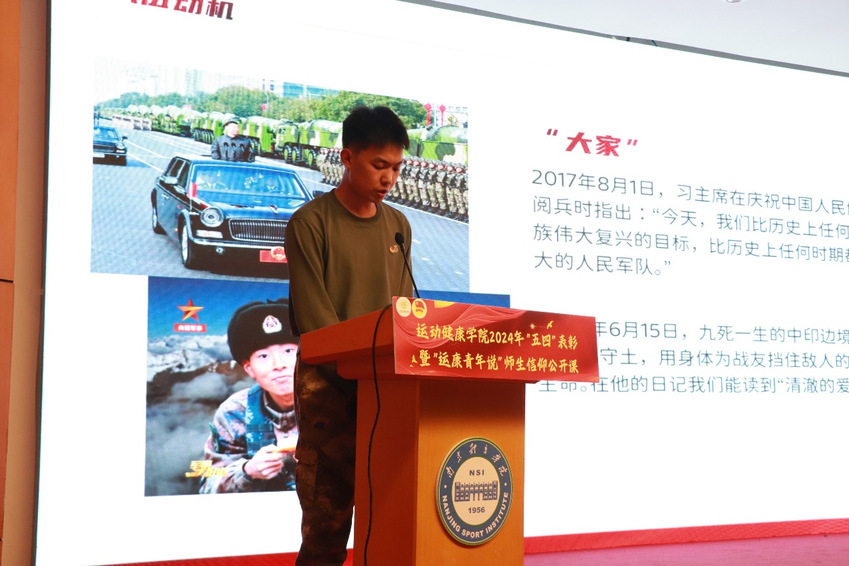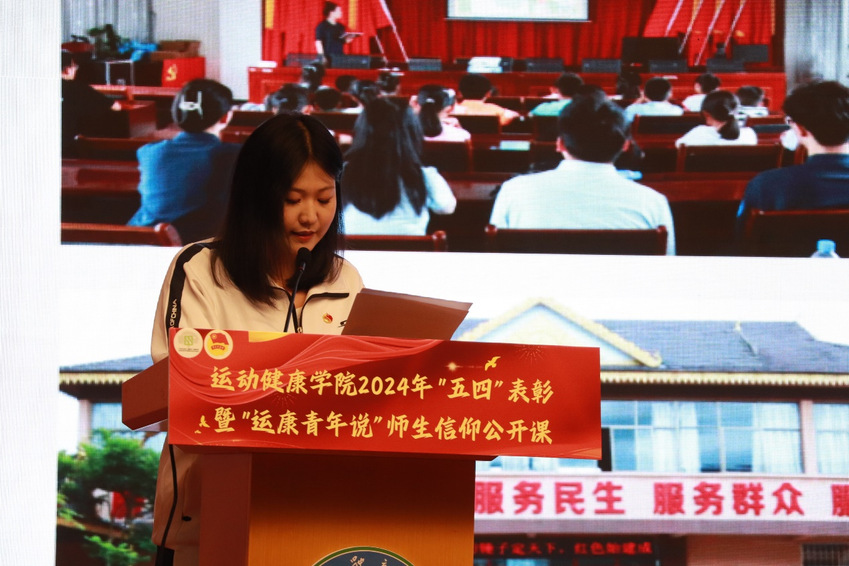为引领广大青年深入学习贯彻习近平总书记五四重要寄语精神,表彰2023-2024学年度运动健康学院涌现出的先进集体、先进个人,团结带领广大青年成长为有理想、有担当、能吃苦、肯奋斗的新时代好青年。5月16日晚,运动健康学院在图书馆第一报告厅举办青春之我 挺膺担当——“五四”表彰大会暨“运康青年说”师生信仰公开课。运动健康学院党总支书记丁永亮、院长汤强、党总支副书记阚妮妮、副院长赵彦出席本次活动,学院青年教师代表和团员青年代表参加活动。