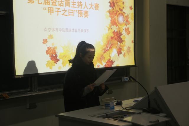 2016年11月22日晚,民族体育与表演系第七届“甲子之曰”金话筒主持人大赛预赛在教学楼第三阶梯教室举行,本次比赛系学生会特别邀请学工处程青老师担任主评审,系学生会各部部长担任辅助评审,系辅导员王一迪老师也出席了本次比赛。