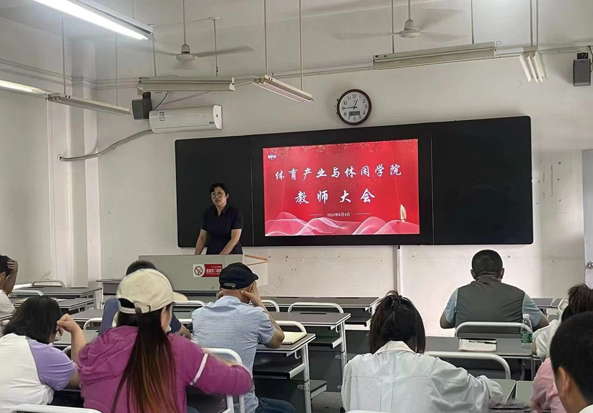 6月4日体育产业与休闲学院在仙林校区401教室召开全院教师教学工作大会,院党总支副书记陈志、副院长柏景岚,全体教师参加会议。会议由柏景岚主持。
