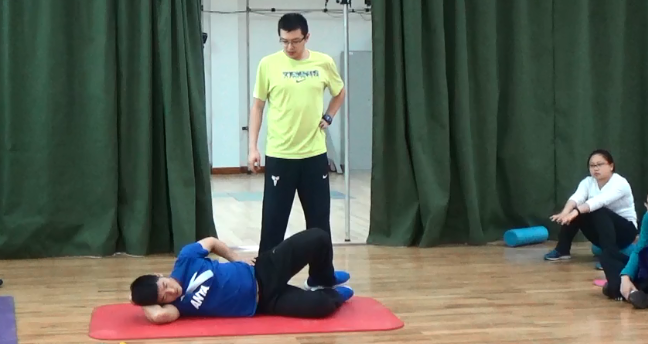 第二天是准备活动(warm up)与整理活动(cool down)的专场教学。准备活动是训练的开端,不仅针对性提高核心区温度,而且激活关节灵活性、稳定性和专项肌群。整理活动能帮助机体在训练后加速恢复。首先,同学们了解了准备活动和整理活动的背景知识。接着是实操练习,同学们切身体会了所有动作。