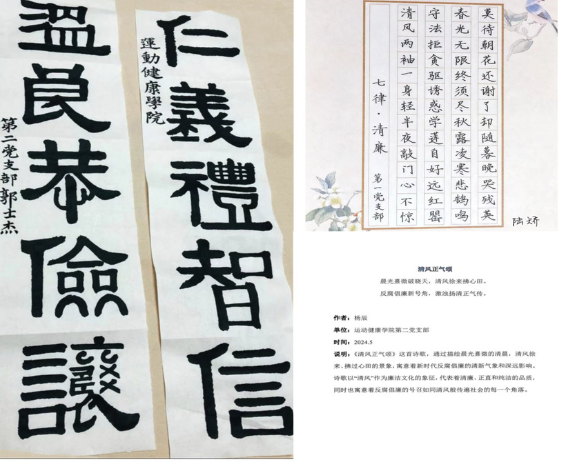 运动健康学院党总支从中华优秀传统文化中汲取廉洁养分,深度挖掘当中蕴含的廉洁元素、廉洁理念,组织师生员工以图绘洁,以文述廉,生动展示了廉洁社会的基本理念和精神追求。青莲意象自古便是廉洁不阿的代表,有人纵笔描绘;有人用书法弘扬中华廉政文化,有人批判贪官污吏,也有人创作廉洁诗歌。一份份作品都将两袖清风、廉洁正直的形象深入人心,将戒贪倡廉、诚实守信的道理娓娓道来,绘就了党风廉政建设、廉洁社会建设的光明前景,表达了运动健康学院师生员工的敬廉崇洁之心声。