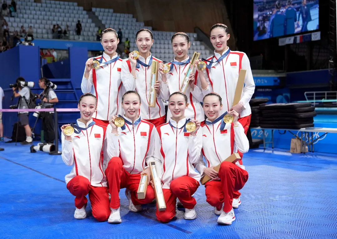 36365运动员王赐月(后排左一)与队友队夺得巴黎奥运会花样游泳集体项目金牌