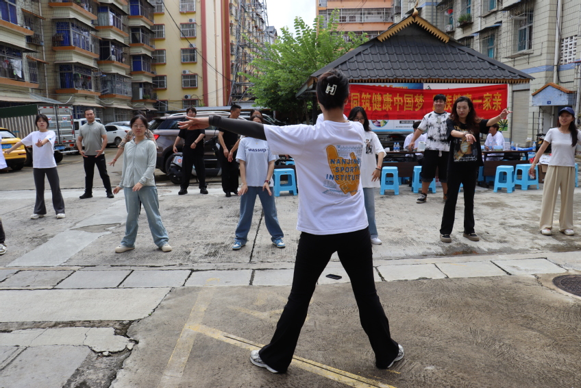 在义诊中发现许多居民都有不同程度地存在运动损伤问题。通过现场的诊断以及提出针对性的建议,团队成员还演示了部分康复动作和训练方法,强调了运动前热身以及运动后的放松。团队成员还结合体育舞蹈和热身操,编排了一套全新的动作。在团队成员的带领下,居民集体学习跳操,以达到预防损伤的目的。