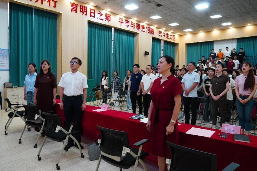 见面会在庄严的国歌声中拉开帷幕。全体师生起立,心中满怀着对祖国的热爱,奏唱国歌。