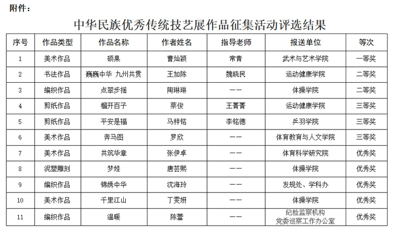 此次征集活动得到了全校师生员工的积极支持和广泛参与,经校外统战工作系统专家及校内专家评审,并报请校领导审核同意,共甄选出一等奖1项、二等奖2项、三等奖3项、优秀奖5项,以及优秀组织奖2项,获奖单位分别是运动健康学院、体操学院。