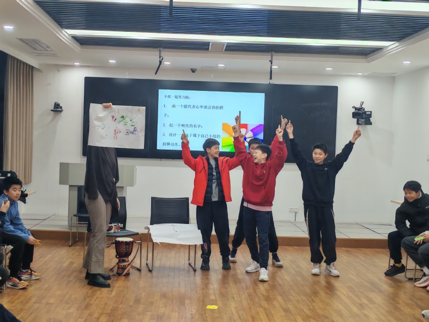 活动伊始,韩老师就敲响鼓点,以“随鼓点,做动作”的方式,迅速点燃乒羽队员们的参与热情。随后,韩老师继续开展心理团体游戏、团体互动这些交互性强、参与度高的心理辅导活动,辅之以心理知识的传授,帮助乒羽学院男生了解语言的“双面性”,以及使用语言的“公域”与“私域”之分,能觉察自己的语言使用习惯,帮助同学们建立文明用语与分清场合讲话的意识。活动现场,这些来自五年级到八年级的同学,时而积极举手表达自己观点,时而热情参与捧腹大笑,最后成群结队地俯下身认真画出自己心中的“语言侠”,摆出自认为最帅的pose。
