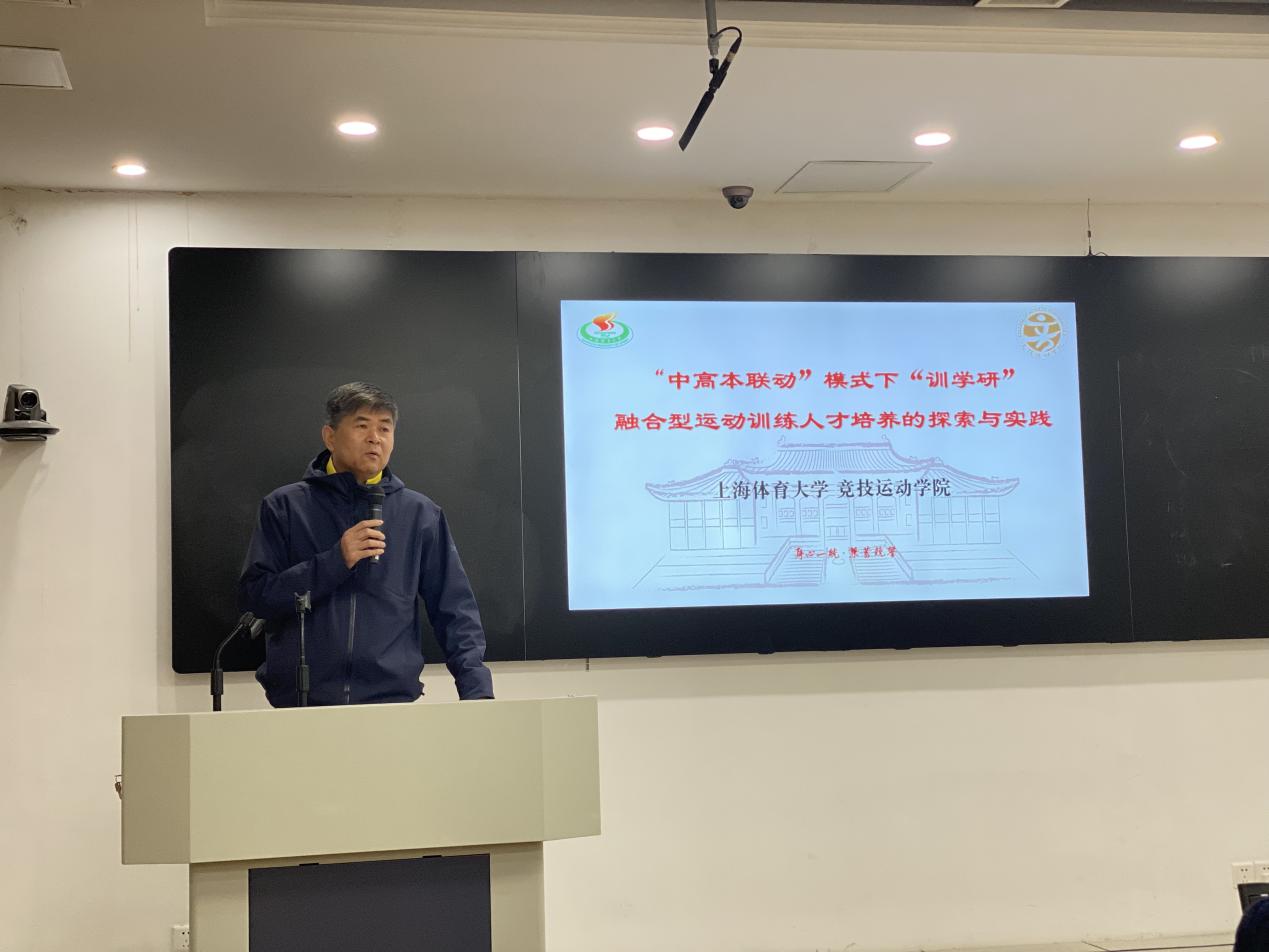 上海体育大学马海峰教授就《“中高本联动”模式下“训学研”融合型运动训练人才培养的探索与实践》做主题报告。从“学科融合”、“科教融合”、“产教融合”三个维度出发,阐述了构建“中高本联动”三层次人才培养模式,形成“训学研融合”三类型人才培养特色及确立“多主体参与”三要素人才培养途径的创新实践。