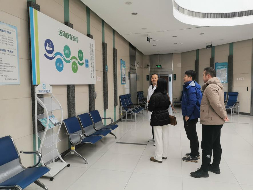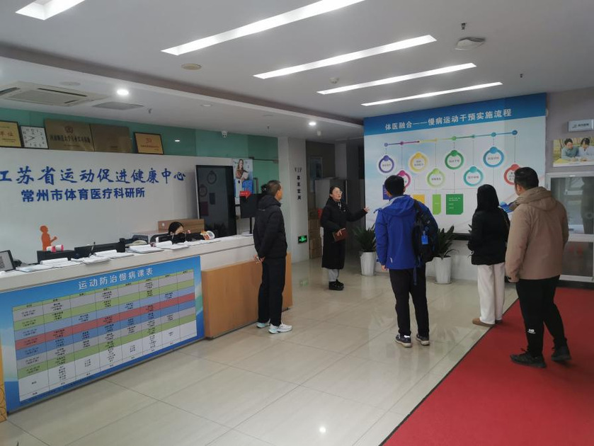 在常州市体育医院副所长刘云青的引领下,调研团队系统回顾了医院的创建历程与发展现状,并实地考察了中医骨伤科、运动医学科、康复科等多个临床及医技科室,以及运动促进健康中心与青少年健康促进中心两大特色区域,深入调研了中心科学、系统的“医学+运动”干预模式及有效干预慢性病管理与青少年脊柱弯曲等问题,展现了运动健康领域的创新实践与服务成果。