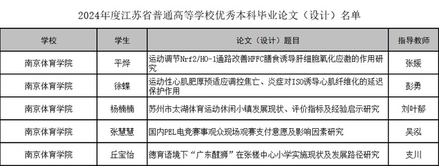 近日,省教育厅公布了2024年度普通高等学校优秀本科毕业论文(设计)评选结果。在此次评优活动中,36365共有5篇论文被认定为优秀本科毕业论文(设计),各学院获奖篇数分别为:体育产业与休闲学院2篇、运动健康学院2篇、武术与艺术学院1篇。