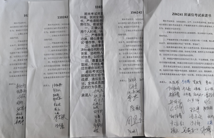 随后24级辅导员戴越在各班级开展诚信考试承诺书签订仪式,引导全体同学做出诚信考试的承诺:树立诚信意识,自觉抵制考试违纪行为,以积极的态度迎接期末考试,共同营造一个公平公正的考试环境。
