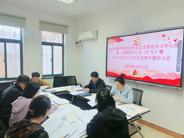 3月21日,运动健康学院召开2025年党总支理论学习中心组第二次集体学习会(扩大)暨2024年度民主生活会会前专题学习会。学习会由学院党总支副书记阚妮妮主持。