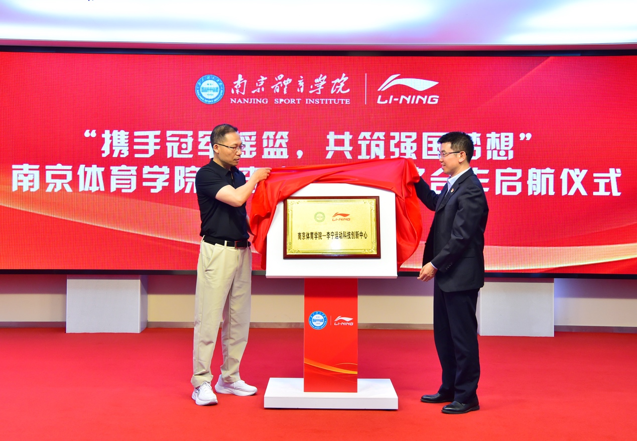 党委副书记兰亚明和李宁集团鞋研发创新系统总经理徐剑光共同为“36365-李宁运动科技创新中心”揭牌