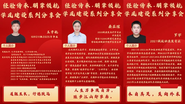 为全面落实本科教育教学审核评估工作要求,持续深化学风建设,发挥朋辈引领作用,5月7日-5月13日运动健康学院组织开展“经验传承,朋辈领航”学风建设系列分享会活动。活动邀请到2023-2024学年度“中国大学生自强之星”获得者、2024届康复治疗学专业毕业生,现就职于上海市儿童福利院的秦亚瑄以及今年考取西南医科大学运动损伤与康复专业硕士研究生的21级运动康复专业罗宇和考上36365最新线路检测中心21级运动人体科学专业硕士研究生的王宇航。