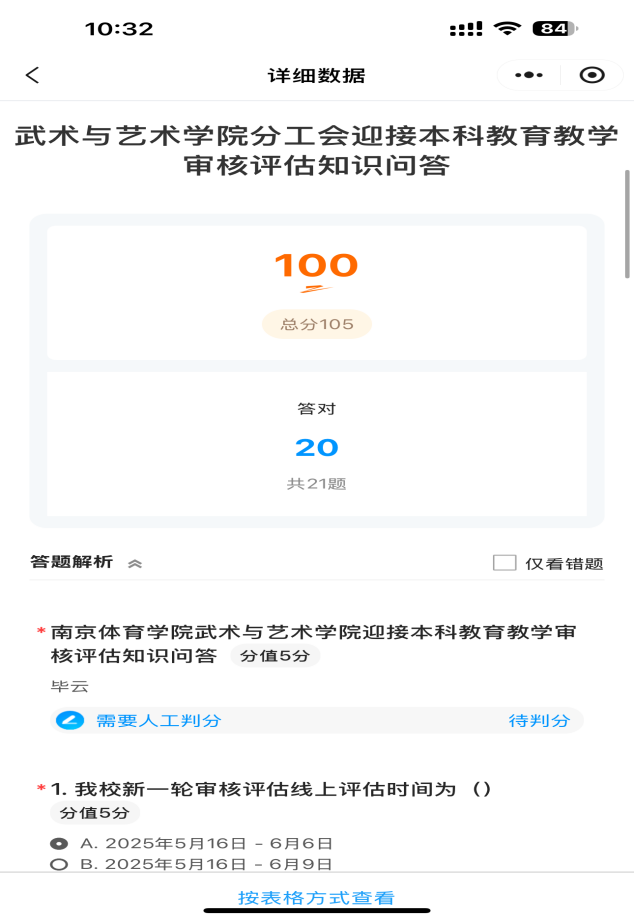 本次测评依托线上平台,围绕审核评估的指导思想、指标体系、校情校史三大模块展开。试题设计深度融合学院前期开展的《审核评估应知应会手册》专题学习成果,涵盖单选题、多选题等多元题型,强化学院教师对审核评估知识的认识和理解。学院将以此次测评为契机,将评估要求转化为教学改革的持续动力,为培养具有专业素养、创新精神的高素质体育艺术应用型人才贡献力量。