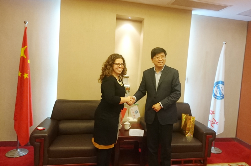 杨国庆院长与阿尔伯塔大学体育教育及康乐学院副院长克里斯汀•马握手致意
