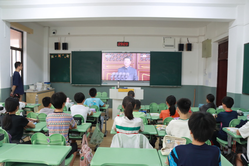 屏幕光影渐暗,心中豪情长存。在观看结束后,各班级开展了20分钟“我的观看感受”的分享会。 学生纷纷感慨于那些整齐划一的步伐、那些尖端先进的武器装备、那些坚定无畏的面容,身为中华儿女,大家倍感自豪。教师则引导学生进一步明确阅兵式的意义:八十载风雨兼程,八十载砥砺前行。 革命先辈用鲜血换来的和平与繁荣,正在新一代青少年手中传承发扬,今日之观阅兵式,不仅要铭记历史,更要珍惜现在,踔厉奋发,报效祖国,为未来开创序章。