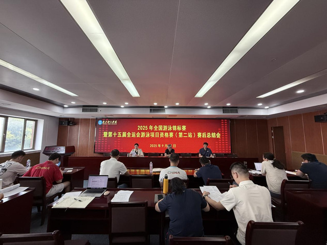 9月17日上午,游泳学院游泳队在行政办公楼201会议室召开2025年全国游泳锦标赛暨第十五届全运会游泳项目资格赛(第二站)赛后总结会。党委常委、副校长刘健出席会议。游泳学院党总支书记骆晓娟、院长王伟新、游泳队全体管理干部、一线教练员、体能教练及科医保障人员参加会议。会议由王伟新主持。